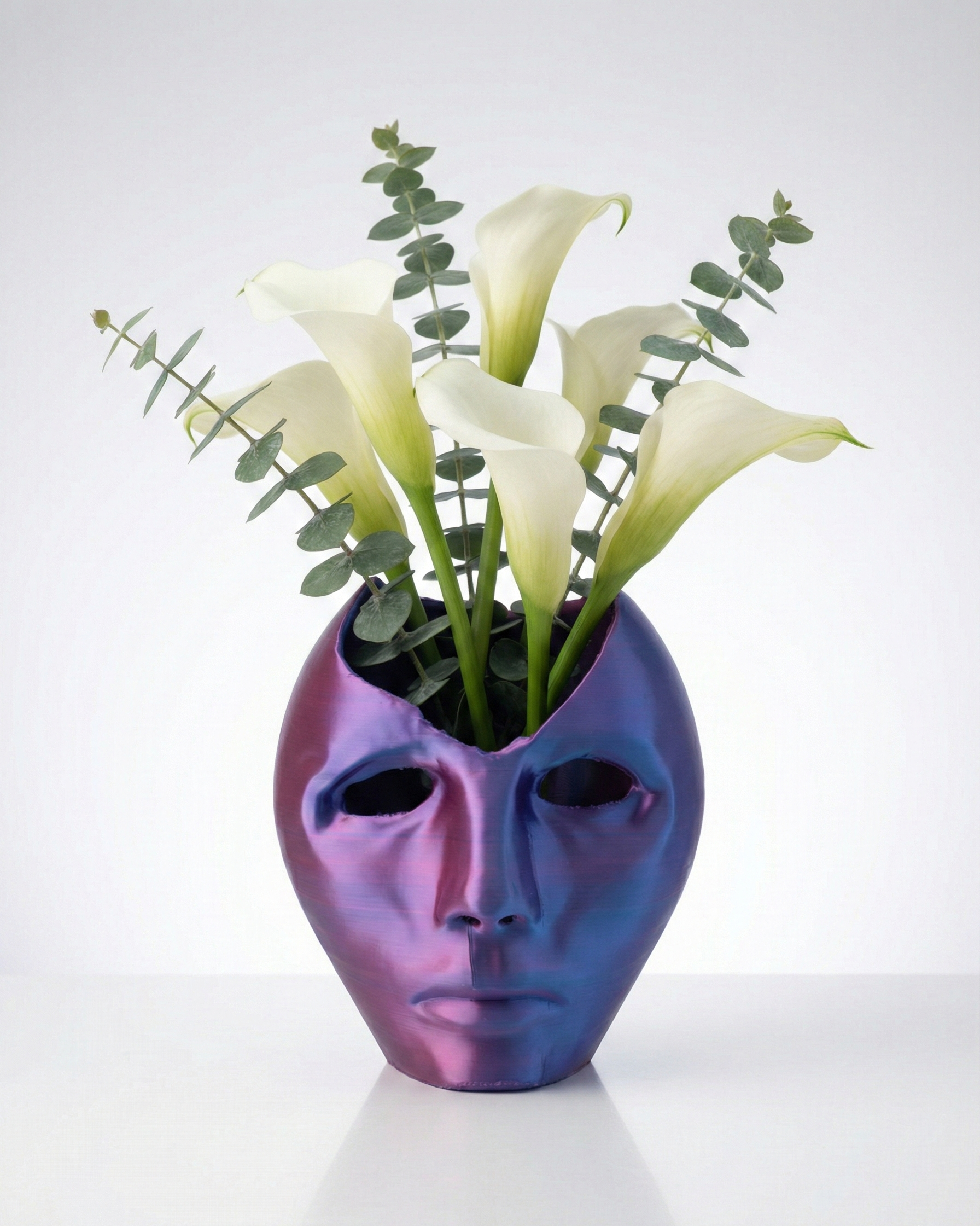 Elevate your workspace with this striking piece of functional art. This abstract sculpture features a "broken mask" design, hollowed out to serve as a versatile container. 3D printed in high-quality dual-color silk filament, the surface boasts a mesmerizing iridescent finish that shifts between deep royal blue and vibrant magenta depending on the lighting and angle. It serves perfectly as a conversation starter while keeping your creative tools or dry floral arrangements organized